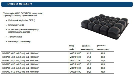 Poduszka MOSAIC® jest przeznaczona dla pacjentów, którzy zachowali częściowe lub pełne czucie. W przypadku osób o wysokim ryzyku wystąpienia odleżyn lub posiadających już istniejące uszkodzenia skóry zaleca się stosowanie poduszek neoprenowych w technologii ROHO® DRY FLOATATION®.